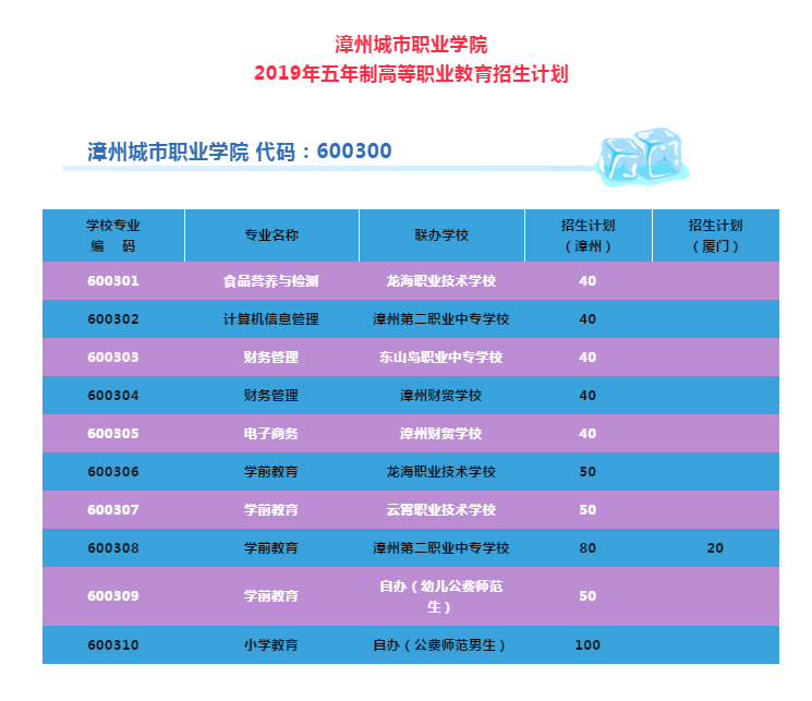 漳州城市职业学院2019年五年制高等职业教育招生计划